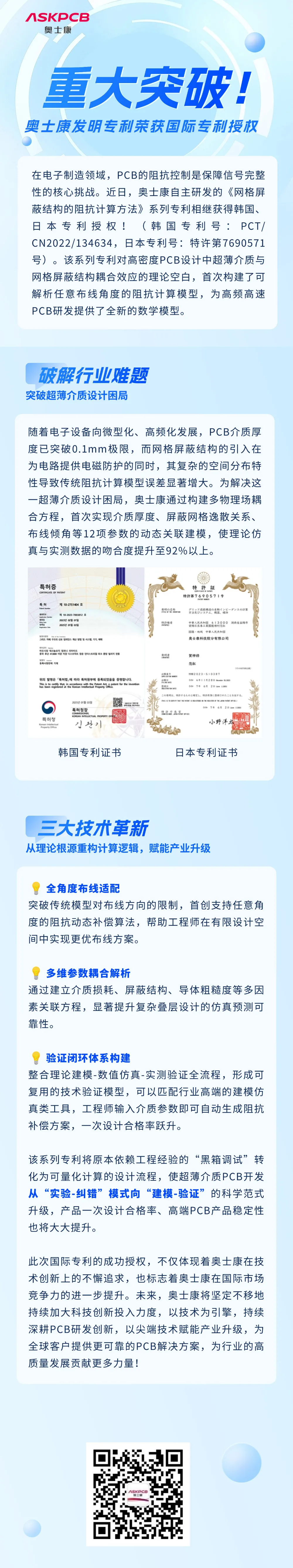 重大突破!奧士康網格屏蔽結構阻抗計算方法榮獲兩項國際專利授權